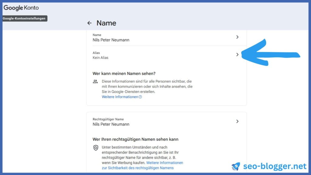 2️⃣ Die Anonymisierung erfolgt über eine Änderung des angezeigten Namens im eigenen Google-Konto. Dieser Alias wird anderen Nutzern als öffentlicher Name angezeigt – auch bei bereits veröffentlichten Bewertungen.