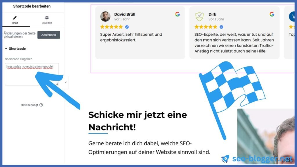 Füge den zuvor kopierten Shortcode in das Shortcode-Widget ein. Sobald du die Seite aktualisierst, werden deine Google-Bewertungen automatisch an dieser Stelle angezeigt: