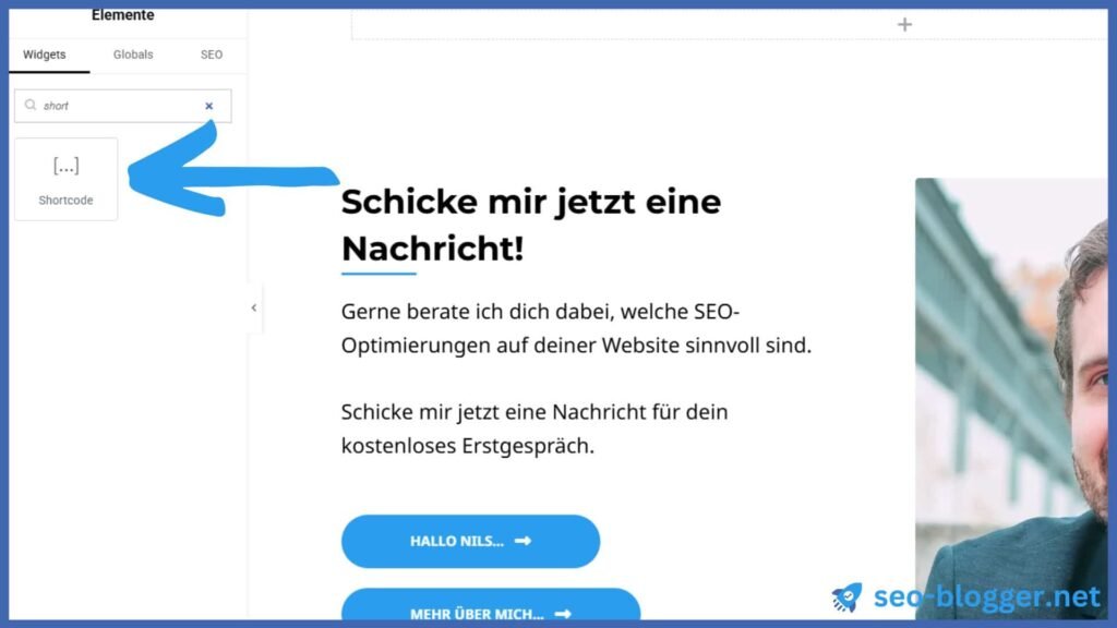 Öffne nun die Seite, auf der du deine Google-Bewertungen anzeigen möchtest, und bearbeite sie mit deinem Page Builder. Verwendest du Elementor, ziehst du einfach das Shortcode-Widget an die gewünschte Stelle auf der Seite: