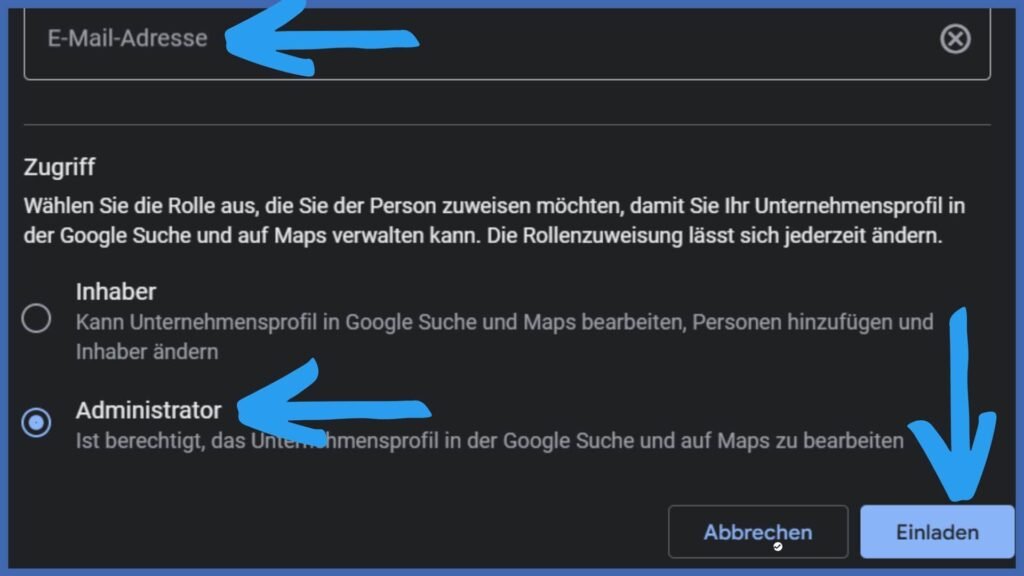 Jetzt kannst du die Person einladen, auf die du dein Google Unternehmensprofil übertragen möchtest: