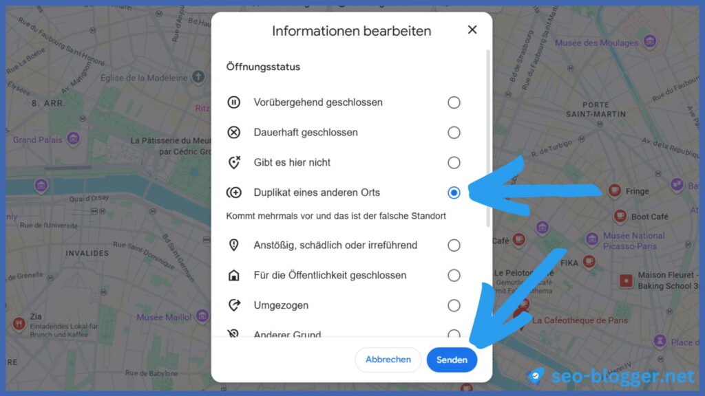 Damit meldest du Google offiziell, dass dieses Profil ein Duplikat eines bestehenden Unternehmensprofils ist.